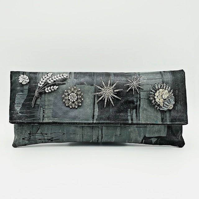 It took a while to find a grouping of five similar-in-shape vintage but unrelated brooches except the two starbursts - a unique set from the 1950s. Five brooches and one (Chanel?) earring works well on this silvery gray and black abstract clutch. Each piece was sourced from different antique shops and fairs, from Palm Beach to North Carolina and beyond. Cocktail to black tie.