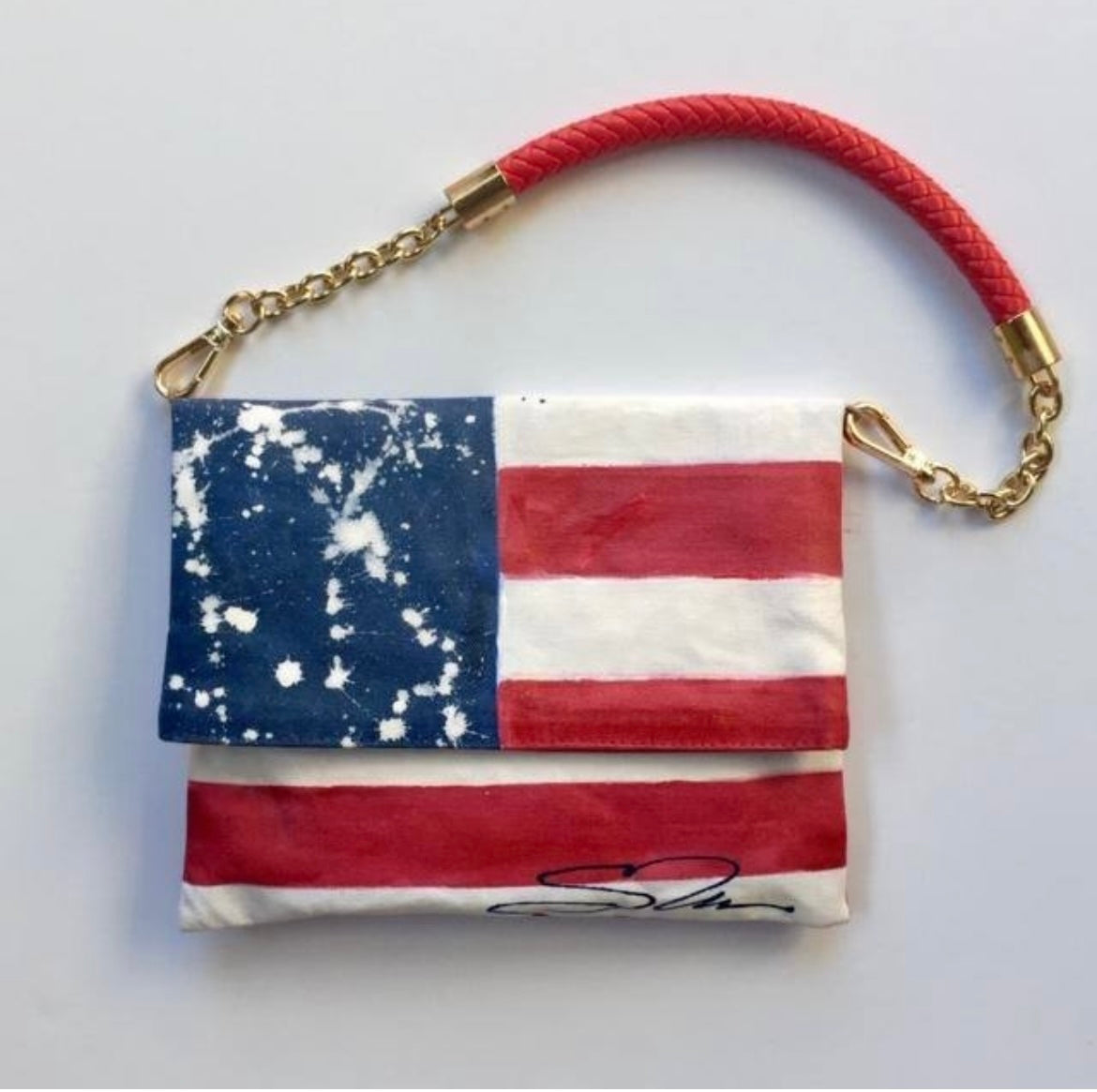 Our red, white and blue USA flag bags are our best sellers. We love making them. Stars, splatters and stripes are all uniquely painted (imperfections included). This one has a white leather and brass chain strap which can be swapped out for a shortie or braided Chanel chain strap.