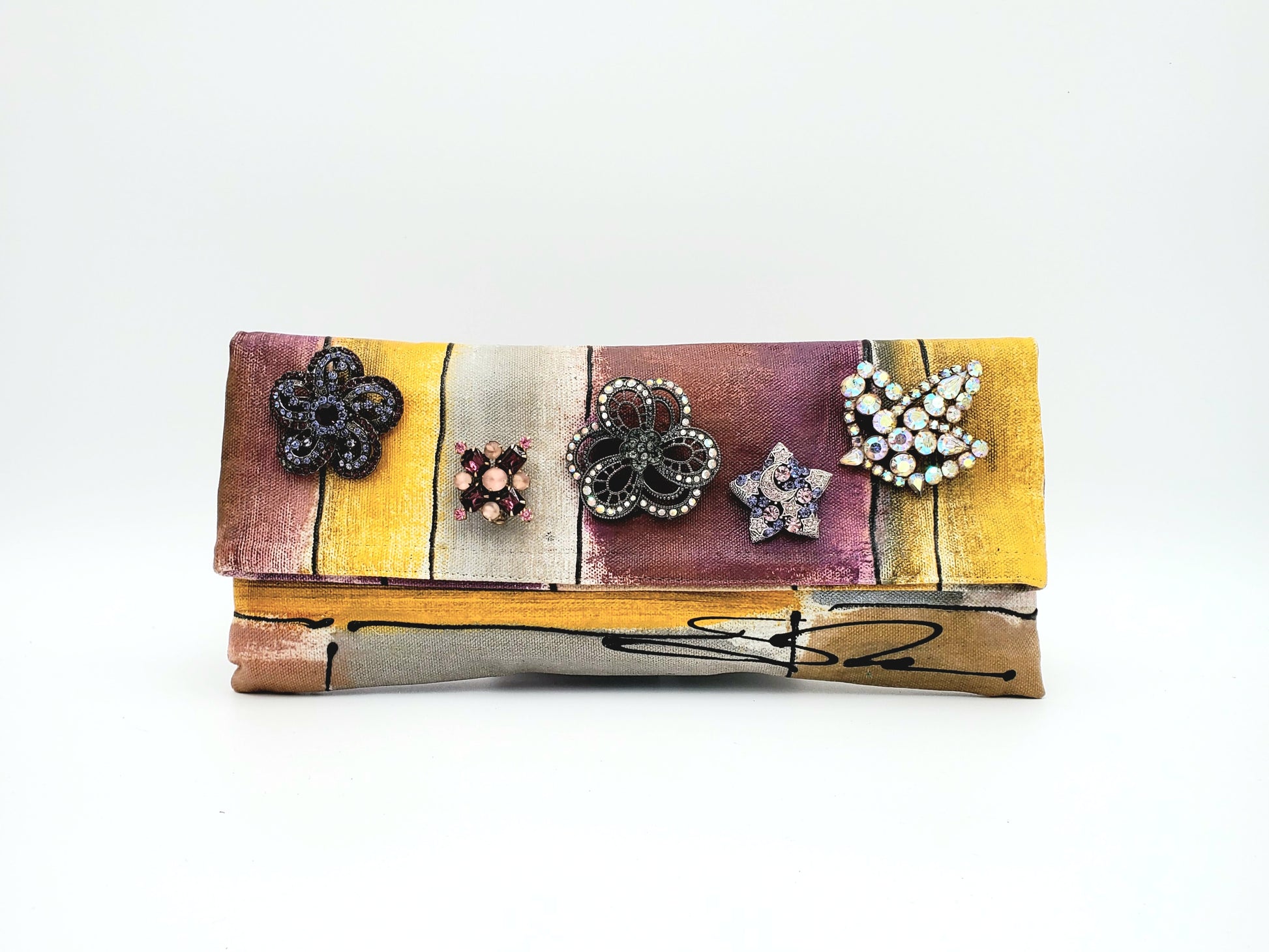 It took years to find a grouping of 1930s-40s era vintage but unrelated brooches in similar hues. Each piece (crystals, rhinestones, gemstones) was sourced from different antique shops and shows, from Palm Beach to North Carolina; Queensland, New Zealand and beyond. The plum-colored background works well against the amethyst and violent-colored brooches. The bright gold adds some pop to the bag. Cocktail to black tie.