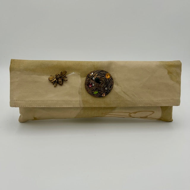 One of our favorite vintage brooches (circa 1950s), this beautiful gemstone-encrusted brooch is crafted of multiple colorful stones and brassy gold that we discovered it in a small-town antique shop. We paired it with a subtle hint of light and dark golds, added a matching brass bee, then signed it in a complimentary gold to tie it all together. We love the understated elegance so this bag can be worn with a multitude of colors and can be worn day and night.